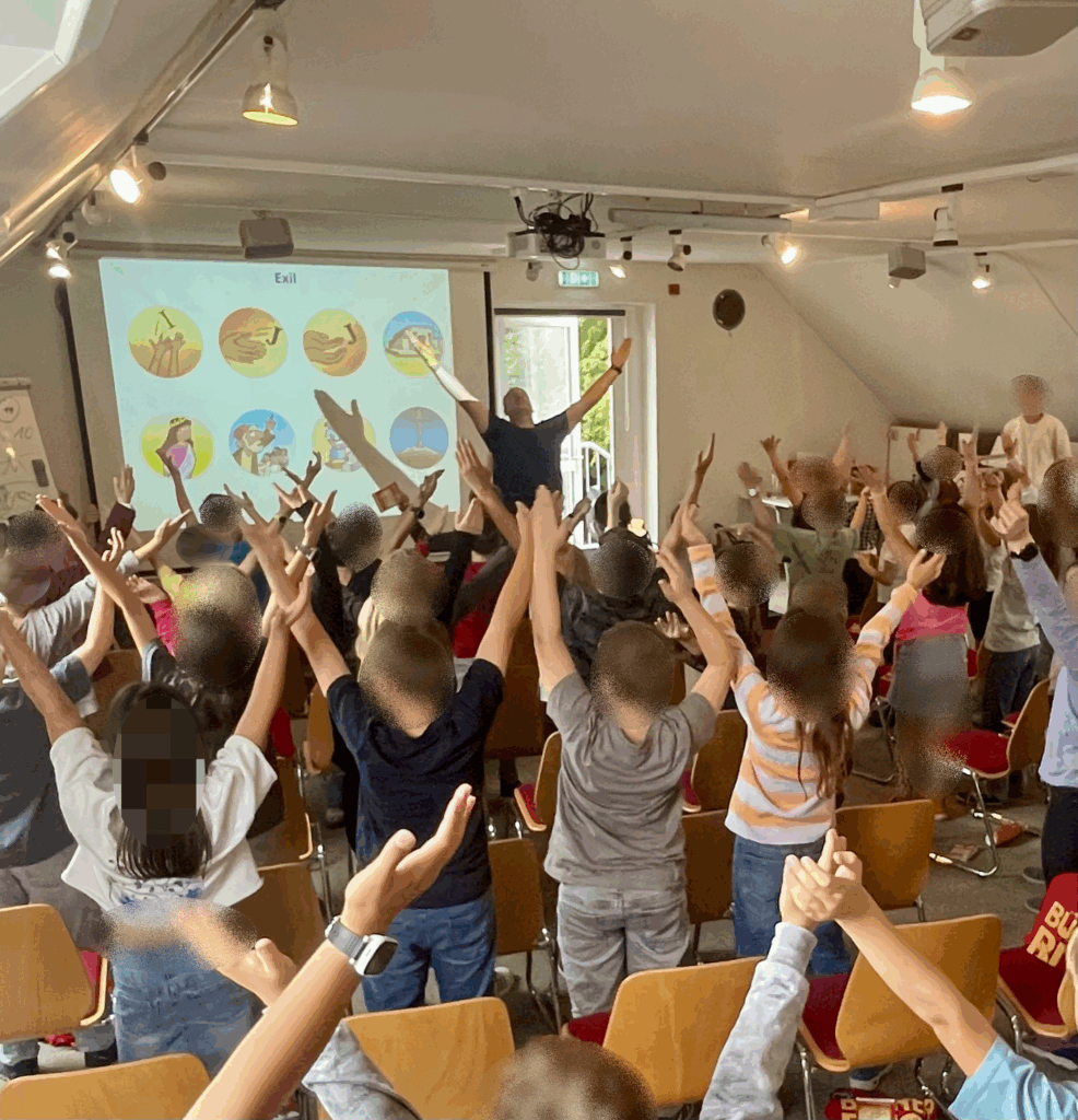 Lars wiederholte mit den Schülern die Geschichten des AT, welche den „roten Faden“ des Handeln Gottes zeigen. Entscheidende Personen und Ereignisse der biblischen Chronologie prägten sich die Kinder durch eine Bewegung ein. Das war gerade für unruhigere Kinder mit einer kurzen Aufmerksamkeitsspanne eine willkommene Abwechslung.